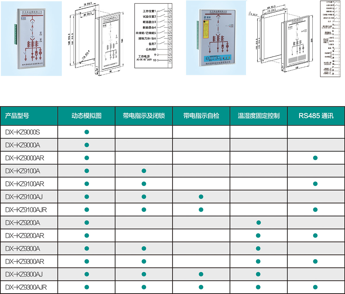 DX-KZ9000系列開關(guān)狀態(tài)指示儀是根據(jù)當(dāng)前中壓系統(tǒng)開關(guān)柜技術(shù)發(fā)展而開發(fā)設(shè)計的一種新型的多功能、智能化模擬動態(tài)指示裝置,集一次回路模擬圖、開關(guān)狀態(tài)、斷路器位置、接地閘刀位置、彈簧儲能狀態(tài)、高壓帶電顯示及閉鎖以及固定溫濕度控制等功能于一體。該產(chǎn)品以一體化布局配套裝備于開關(guān)柜、環(huán)網(wǎng)柜、固體柜,完善開關(guān)狀態(tài)的指示功能和安全性能。