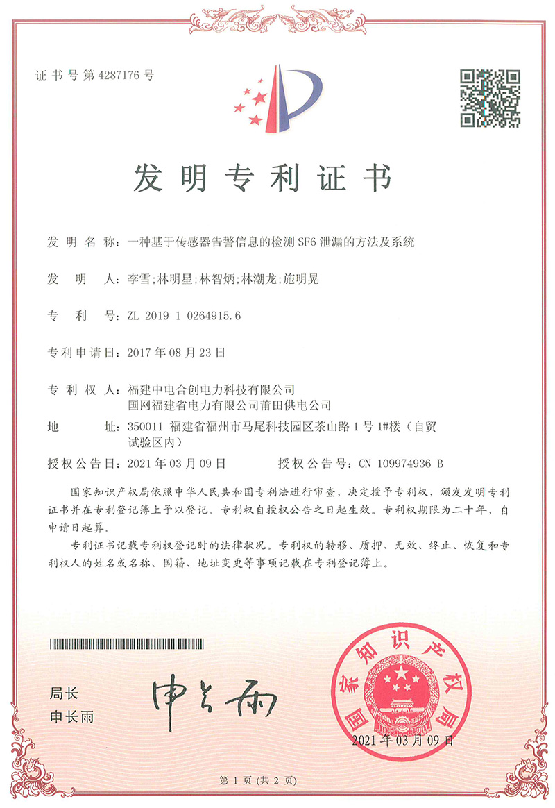 一種基于傳感器告警信息的檢測SF6泄漏的方法及系統發明專利證書